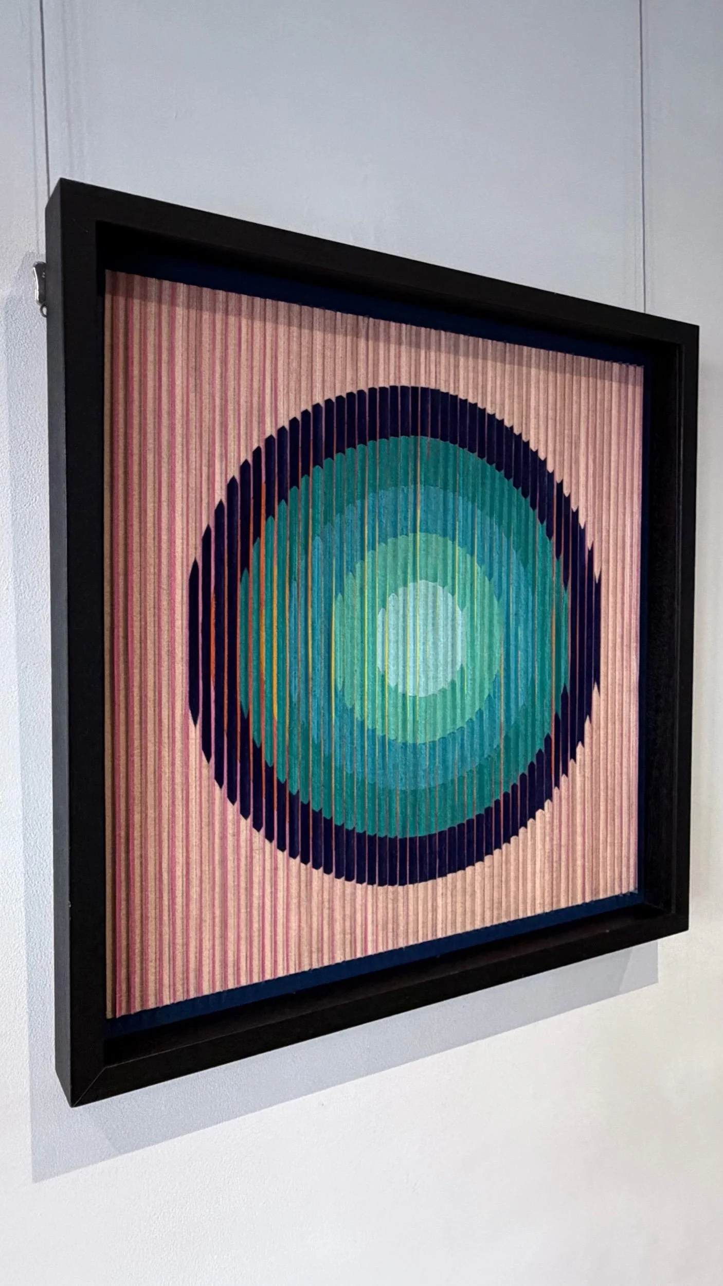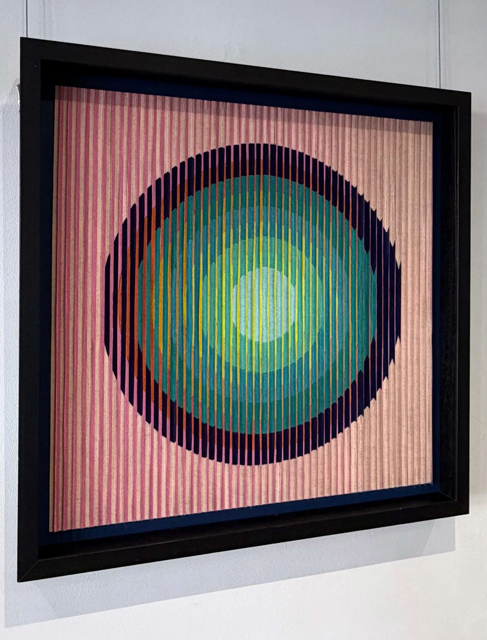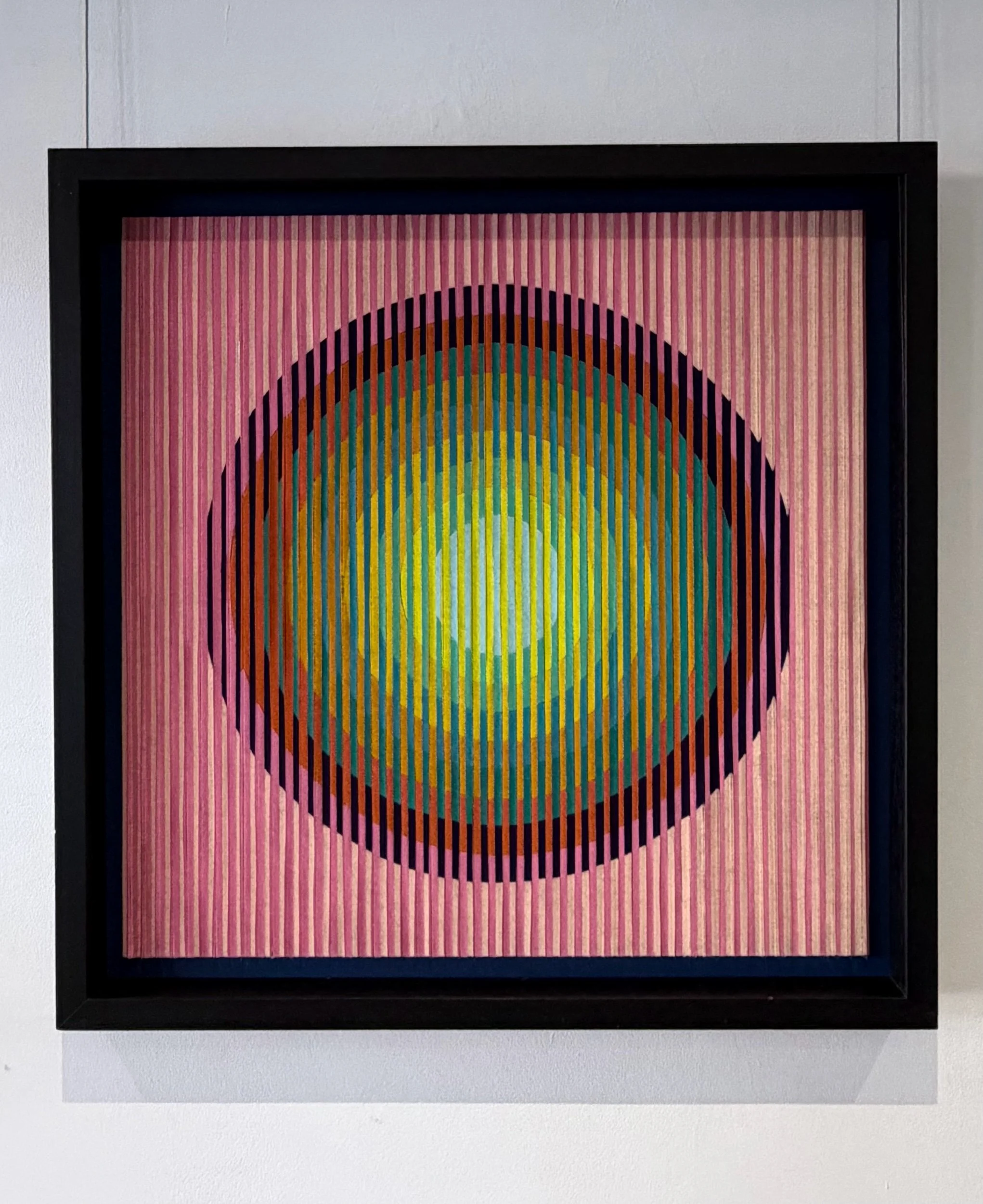 This piece had evolved from the chromatic sunrises, fragmented circles to this simple but effective sun transitioning from chromatic tones of yellow- orange- teals and blues..