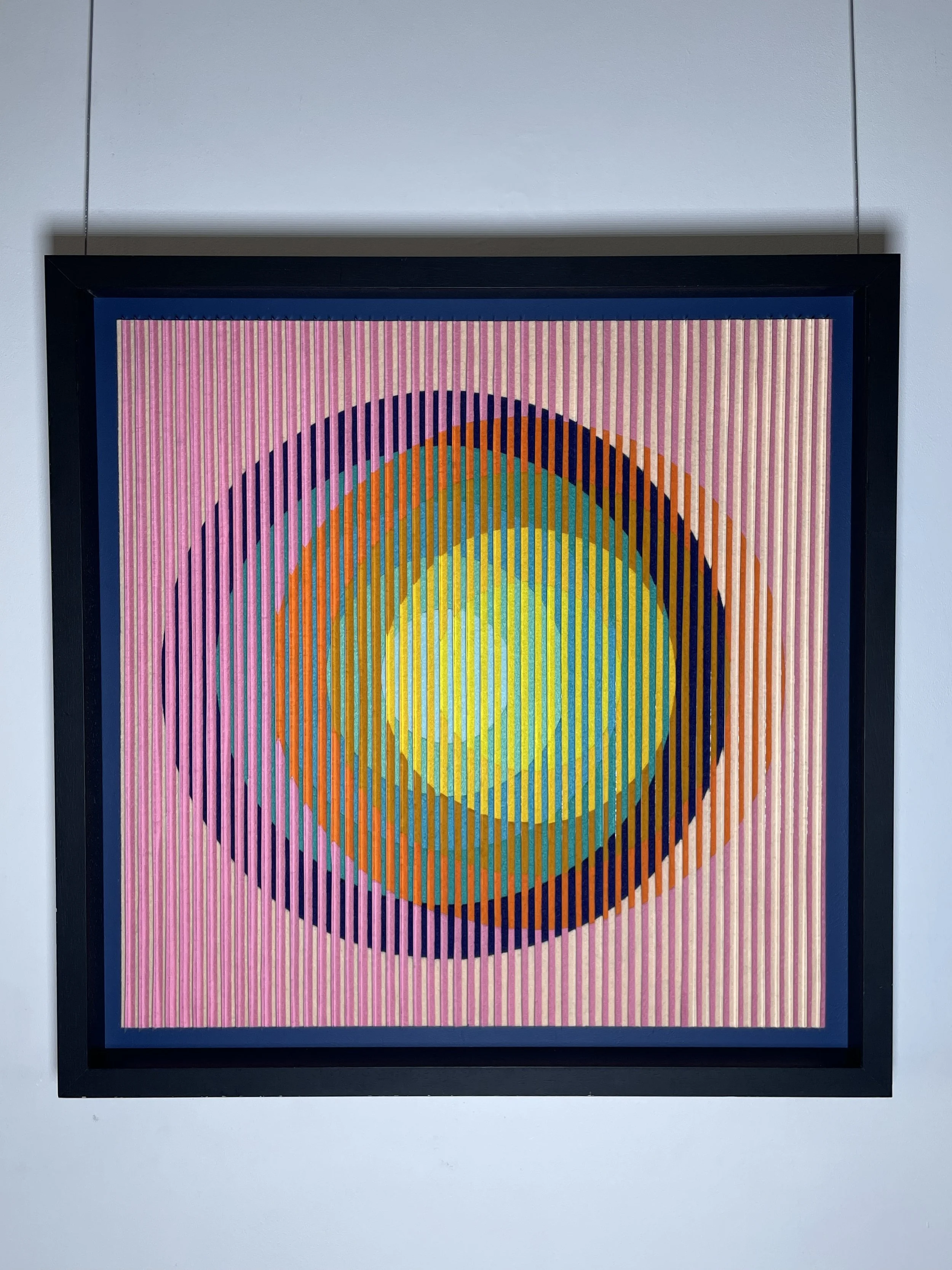 This is the second in the Squarcle series playing with pink squares and a mixed set of circles within a 80 cm sq frame. Each Squarcle is one of a kind in the Squarcle Series