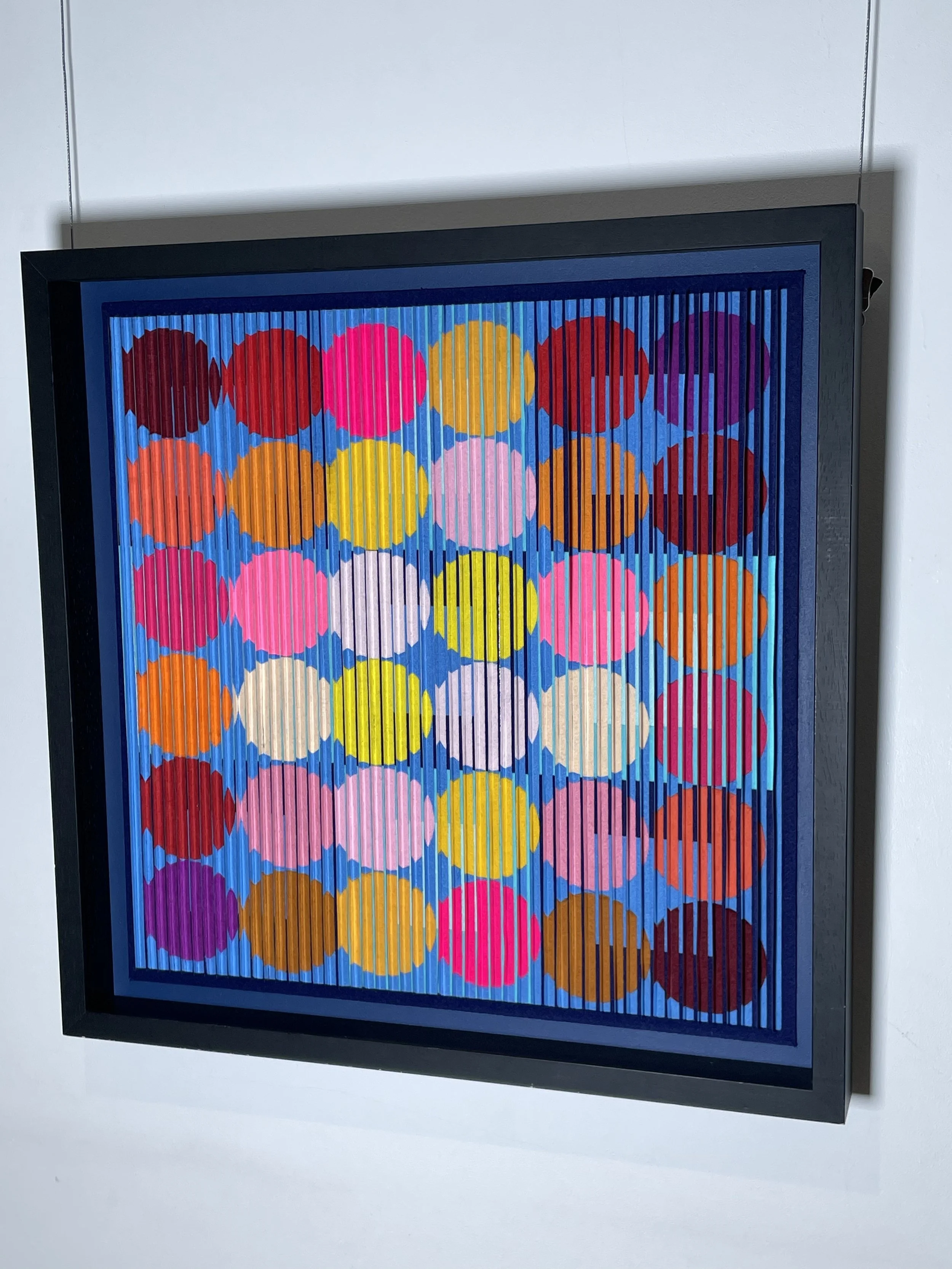 Lenticular Squarcle 6 presents a set of muted grey tone squares against bright circles on a blue hydrangea background. This piece provides dramatic, unexpected colours as you move left to right. Great in a squarcle collection or a single gem.