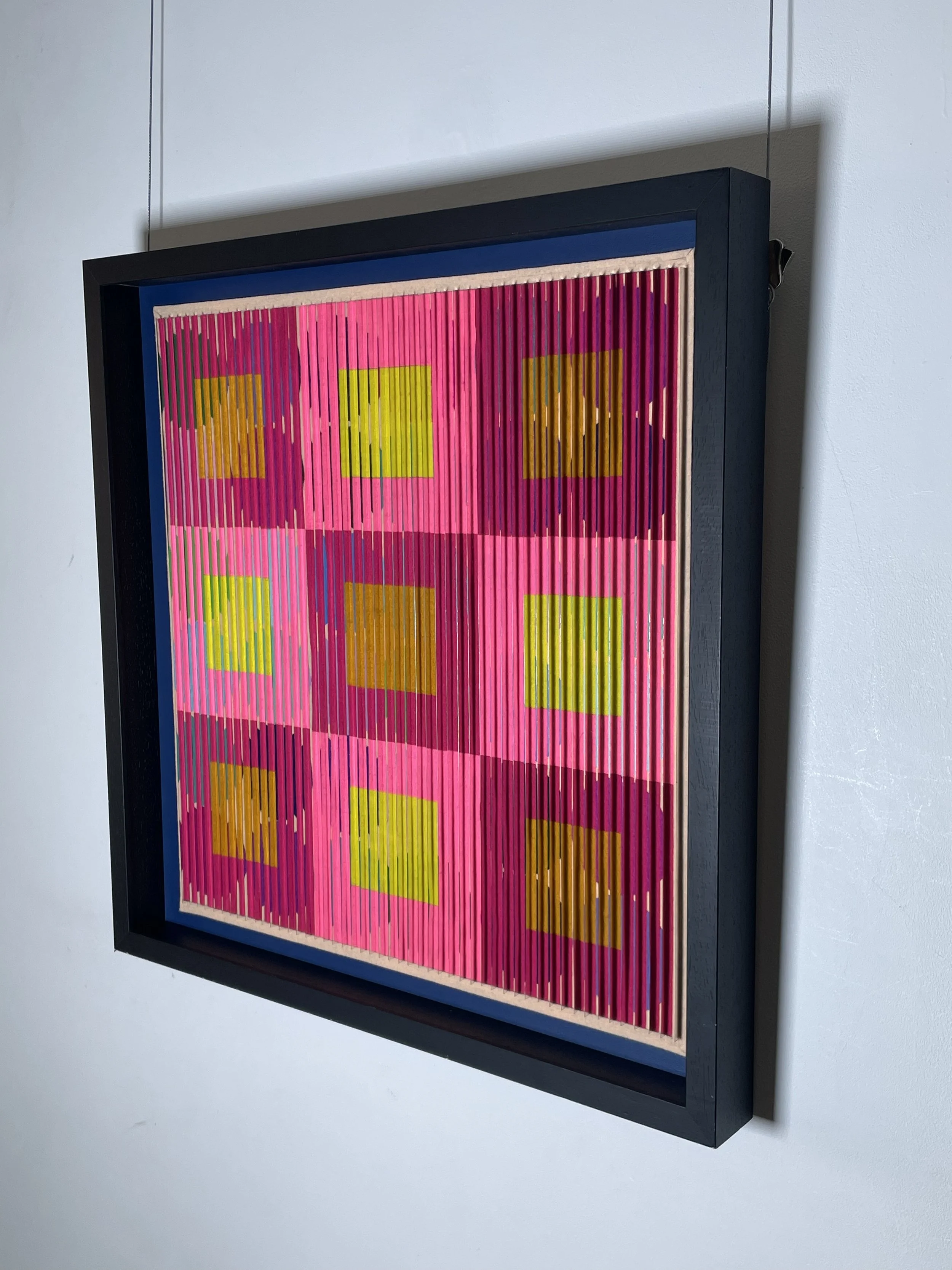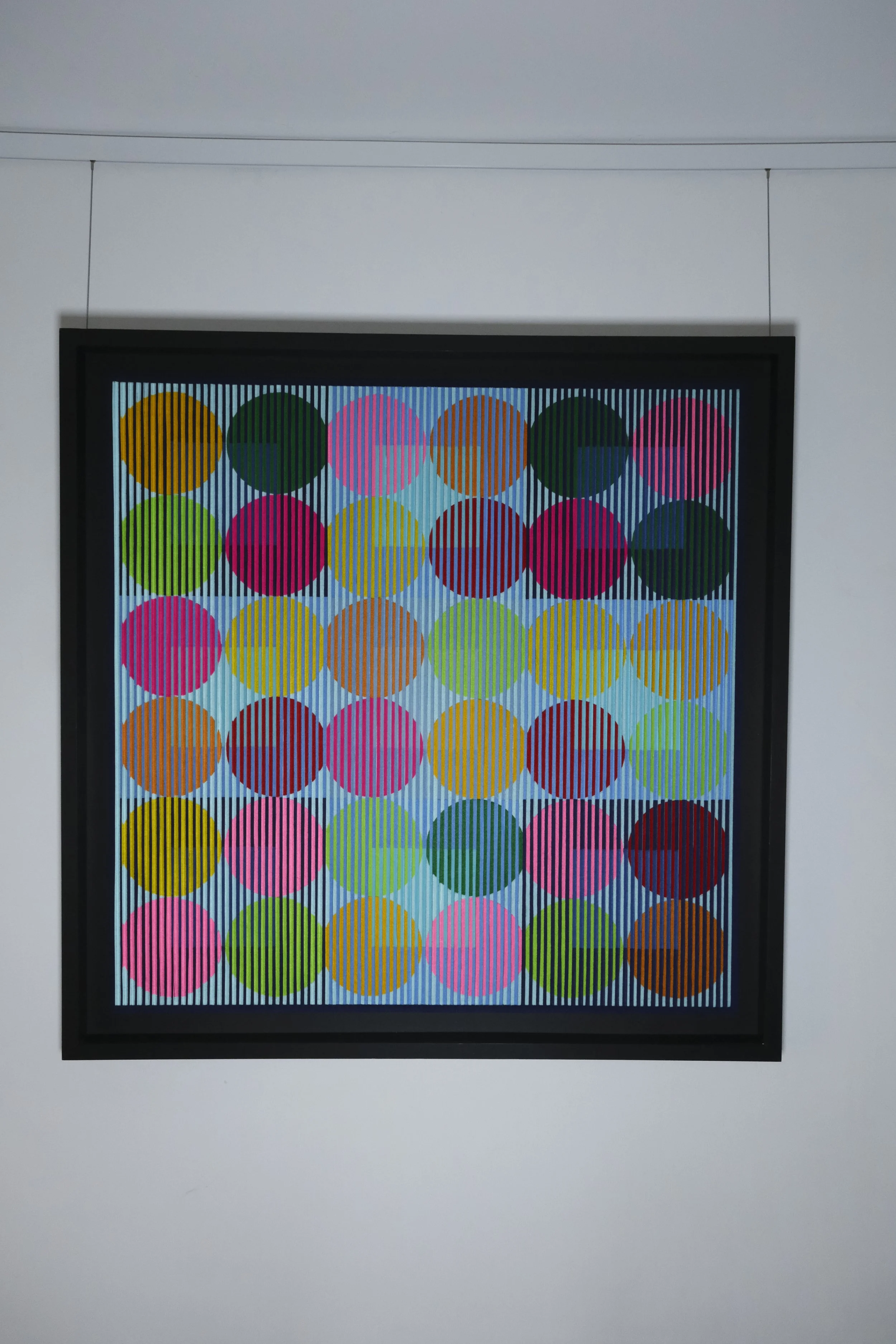 This one of a kind Squarcle presents a range of blue squares against colourful circles on a blue called hydrangea. The circles and squares smoothly appear and disappear momentarily making joint shapes when seen head on.